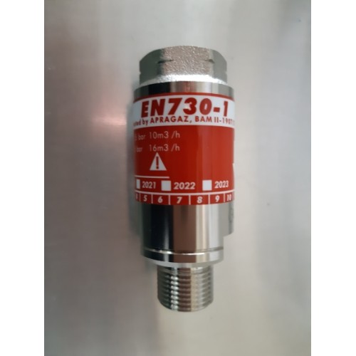 Valvola di sicurezza per riduttore Acetilene/GPL. MV93-RP. Applicata in uscita al riduttore di pressione , attacco 3/8", garantisce la protezione totale contro i ritorni di fiamma e di gas . COD 80255
