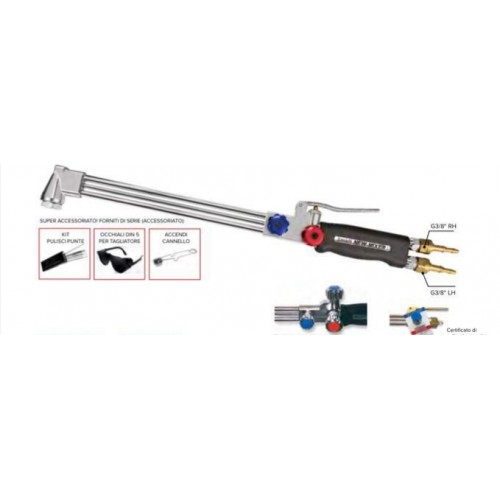 Cannello da taglio (90°) cromato per spessori fino a 200-300 MM, leggero e maneggevole . La miscelazione in punta rappresenta il massimo della sicurezza operativa in quanto i gas ossigeno e acetilene percorrono insieme un tratto ridottissimo prima di trasformarsi in fiamma. la lunghezza del cannello è di 850 MM